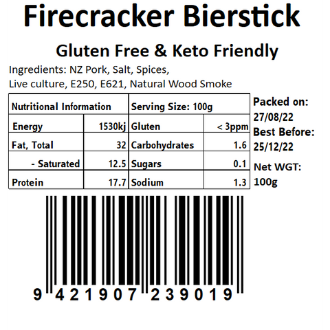 Ingredients- NZ pork, Salt, Spices, Live Culture, E621, E250, Wood Smoke
