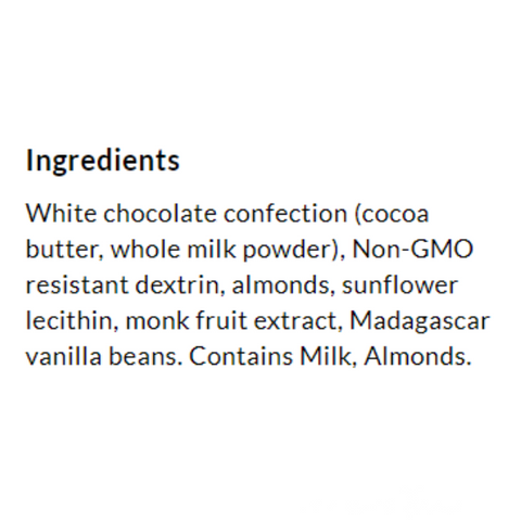 Made with real cocoa butter and Madagascar vanilla beans, this is the low carb white chocolate almond treat your taste buds have been looking for. This creamy chocolate pairs perfectly with roasted almonds, making a decadent treat so good you may not want to share.